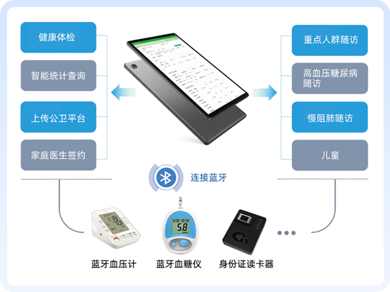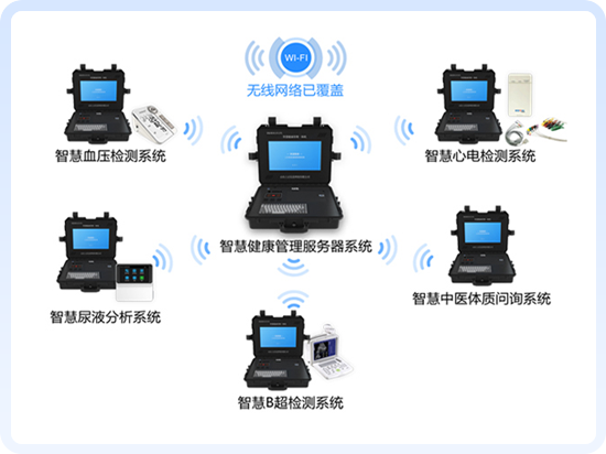 設備由手機、藍牙電子血壓計、藍牙電子血糖儀、十二導心電、藍牙電子秤等組成。